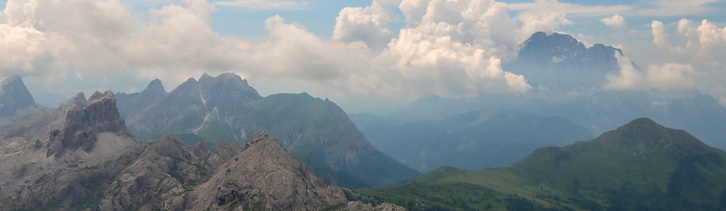 Dnešní počasí je s velkým otazníkem, je tu pravděpodobnosti i silných bouřek hlavně v odpoledních hodinách. Ráno je takové nijaké, celkem podmračené, ale zatím to na déšť ani bouřku nevypadá. Vyrážíme tedy do sedla Falzarego a odtud lanovkou vzhůru na Lagazuoi. Od horní stanice se jdeme nejprve krátce projít k vrcholku Lagazuoi Piccolo. Z celé krátké trasy se otevírají krásné pohledy do světa hor, byť sluníčko tomu dnes přeci je trošku chybí.
