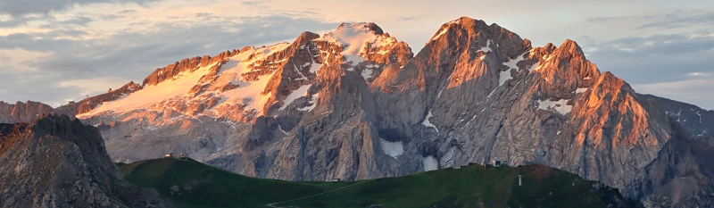 Jasnou dominantou pohledů z kopečka nad sedlem je masiv Sassolungo ale pěkný pohled se z některých míst otevírá i na Marmoladu. Po páté hodině se nejprve začíná barvit obloha.