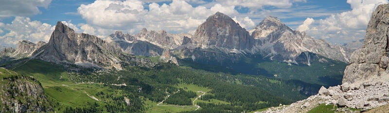 Před polednem jsem konečně nahoře, počasí je skvělé a výhledy dechberoucí, od Tre Cime, přes Monte Pelmo, Civettu, Marmoladu, Cinque Torri až po Tofanu. Opravdu úžasné byť poněkud méně známé místo, na celou tu nádheru jsem tu kupodivu úplně sami.