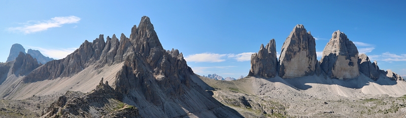 A právě ze sedla můžeme poprvé obdivovat Tre Cime di Lavaredo v plné kráse. Otevírá se také pohled k našemu dílčímu cílu, kterým je chate Drei Zinnen.